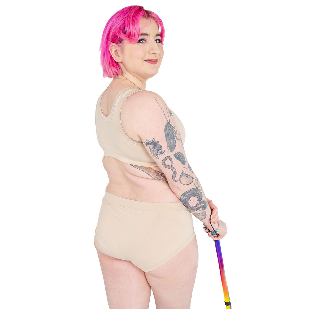 Kat (she/her) is wearing a S cosmic and S mid rise briefs.