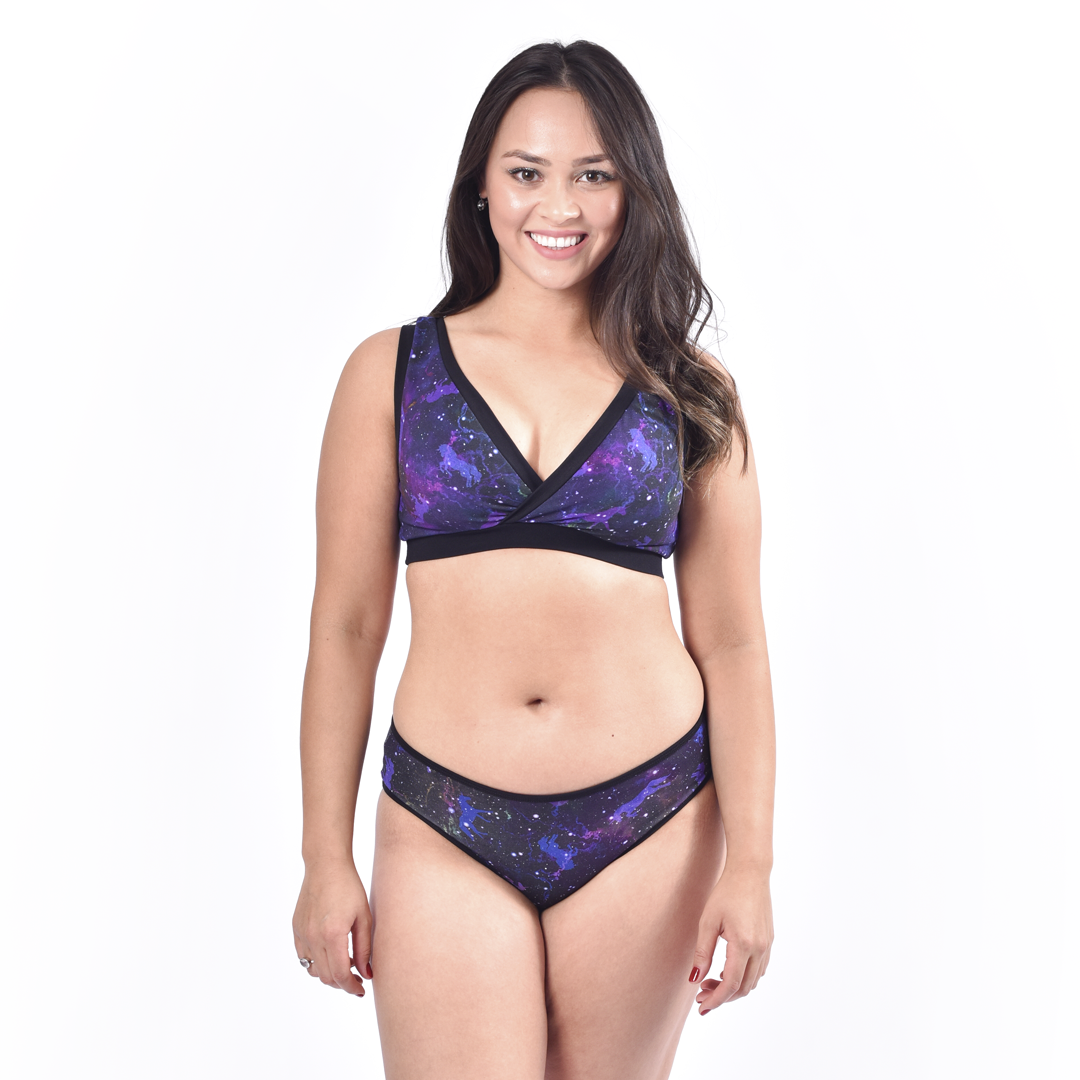Estelle is wearing a non-wired organic cotton Universe bra